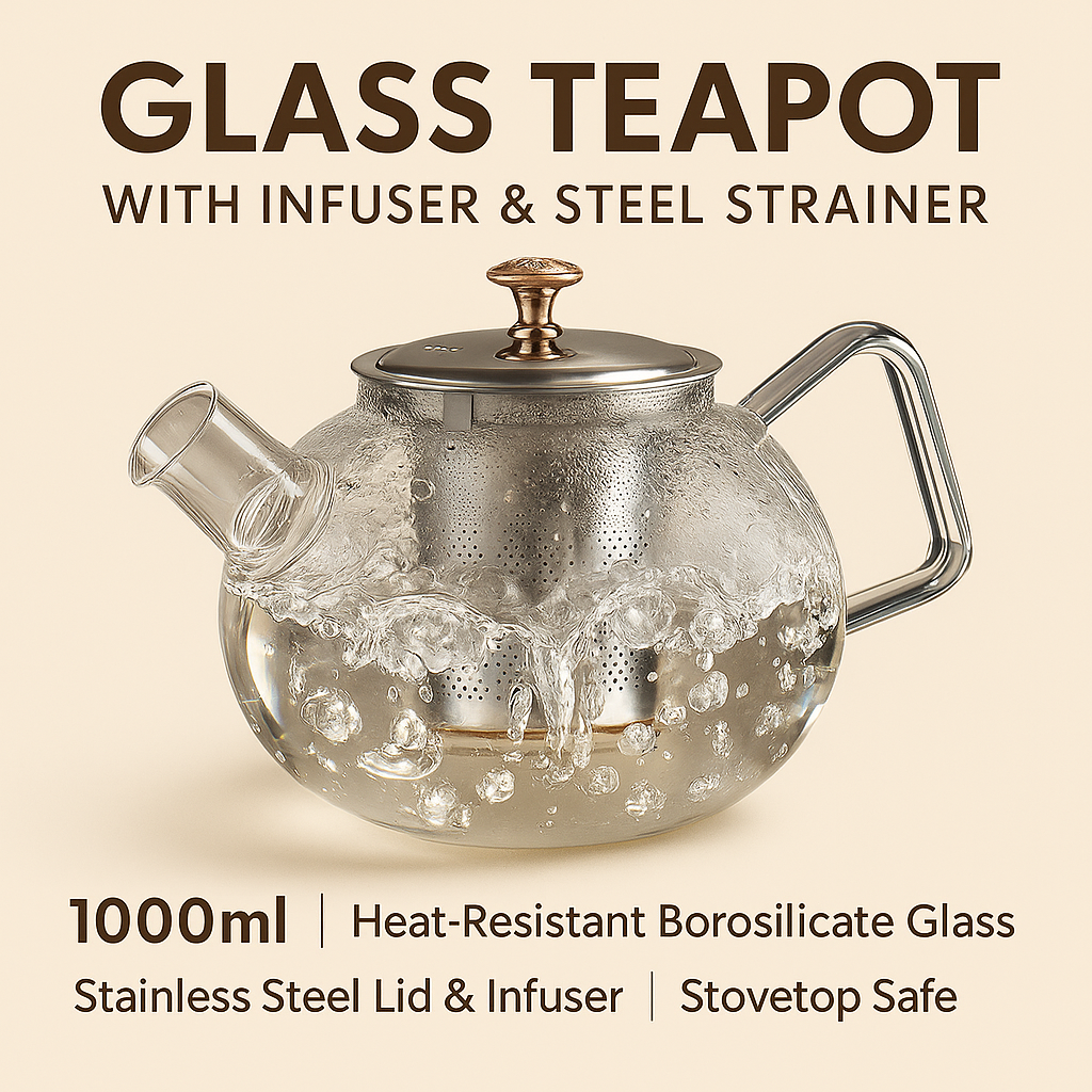 1000ml Glass Teapot with Infuser & Steel Strainer – Stovetop Safe