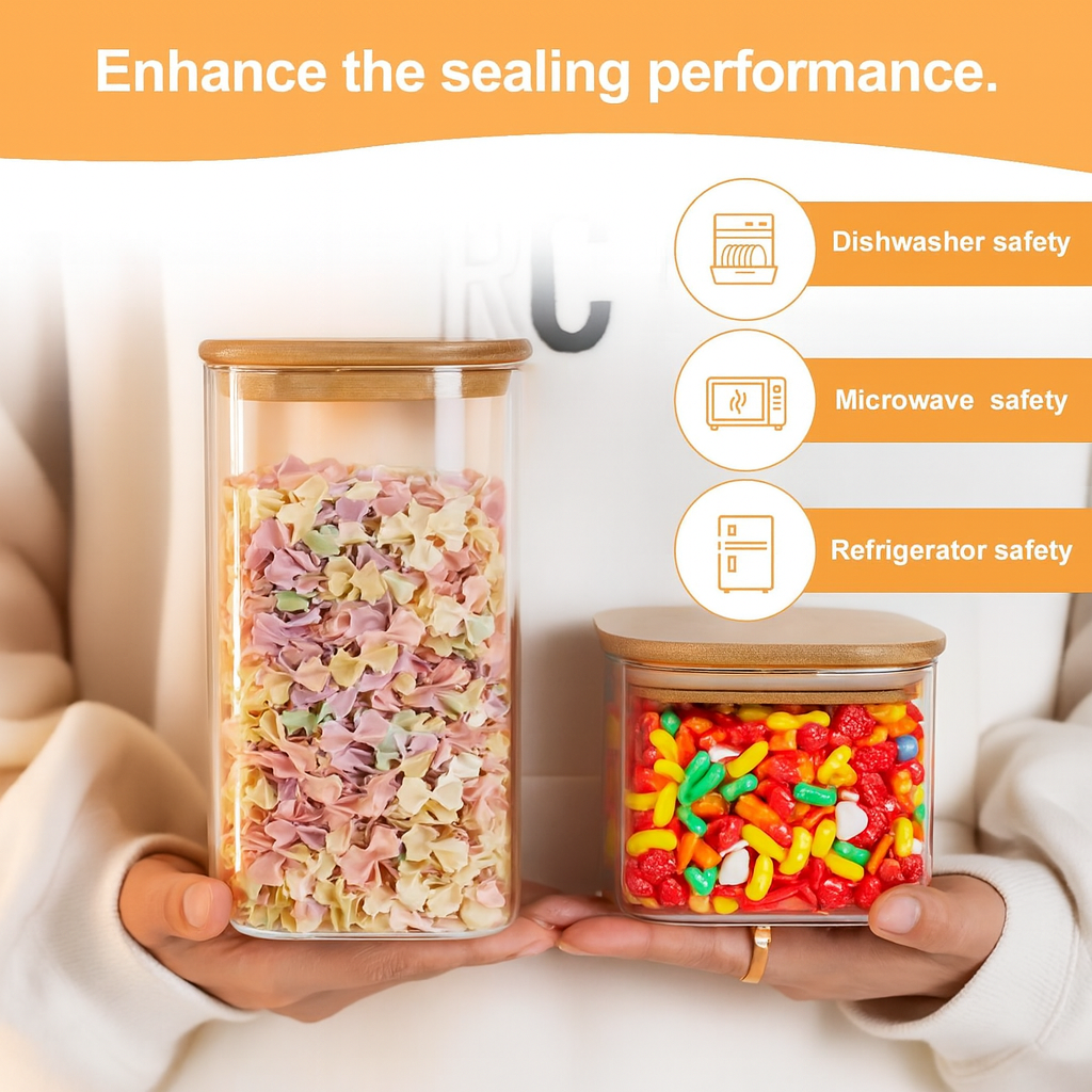 These 37oz clear glass storage jars feature airtight bamboo lids to keep food fresh. Their stackable, square design maximizes kitchen space, ideal for storing candy, cookies, rice, sugar, flour, pasta, nuts, and spices with convenience and style.