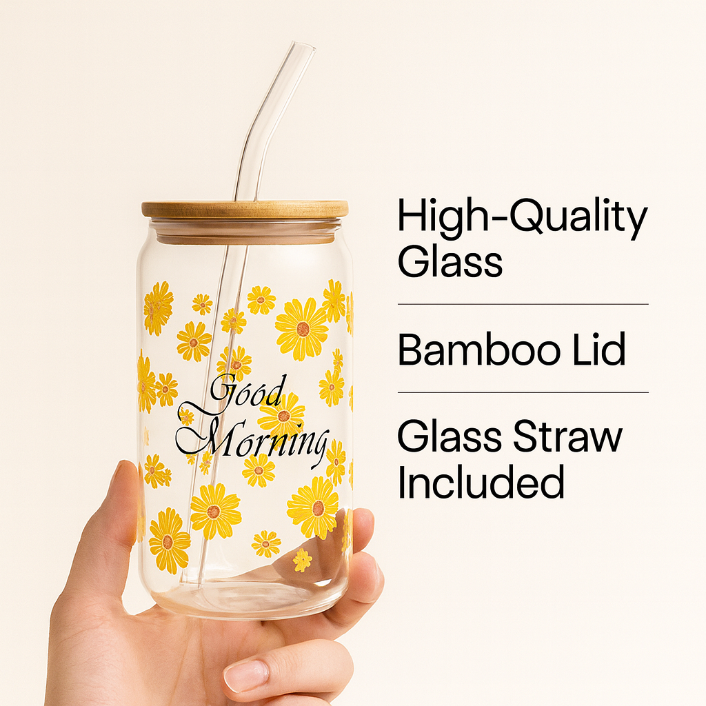 Avastro Yellow Flower Good Morning Print Drinking Coffee Glass Cup with Straws Wine Milk Beer Cola Juice Cold Cocktail Glass with Wooden Lid and Straw 510 ml Pack of 1
