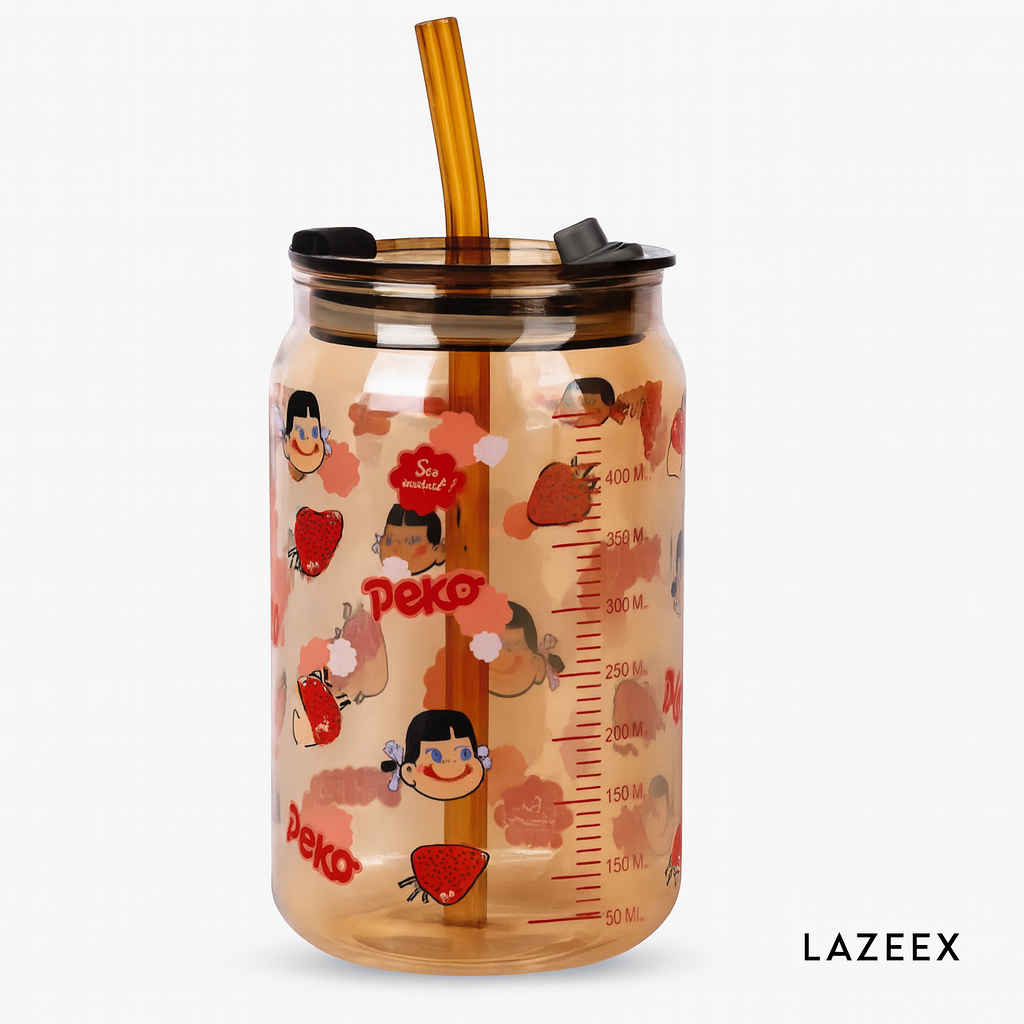 This cartoon glass tumbler includes a silicone straw and lid, offering spill protection and easy sipping. Its versatile design suits various beverages, combining durability with convenience for daily use at home or office. Simple to clean and maintain.
