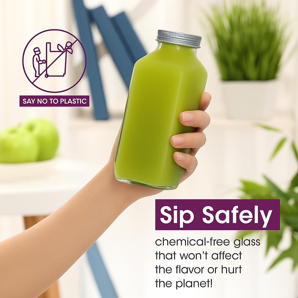 This set of 2 glass French square bottles, each 1000ml, features durable stainless steel lids for secure sealing. Ideal for home, travel, juicing, or storing smoothies, these reusable bottles offer a practical, eco-friendly solution for hydration and food storage.