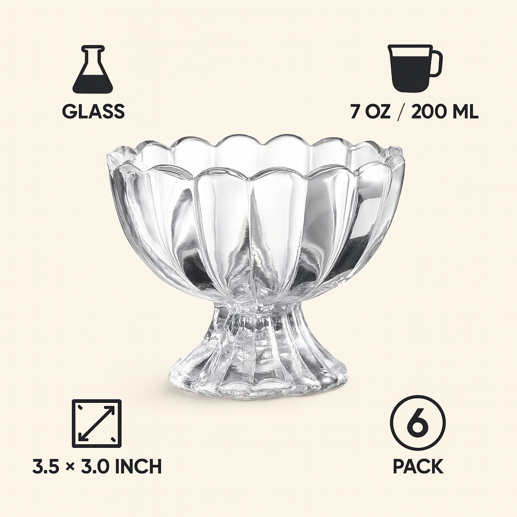 This set of 6 glass ice cream bowls features an elegant wavy design, combining style with functionality. These versatile bowls are perfect for serving ice cream, desserts, or snacks, making them a practical and attractive addition to any table setting.